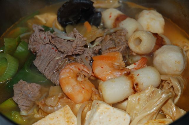 材料/ 韓國泡菜 300克(1/4顆). 牛肉200公克.豆腐1/2塊.凍豆腐1/2塊.大蔥1段.洋蔥1/4顆.鮮蝦5隻.魚丸數顆.竹輪5個.黑木耳1大朶切塊.粉絲一小撮.豆芽菜一把....(其實不用這麼多種材料啦!! 因為昨天剩的多,所以通通放下去,只放肉.豆腐.大蔥.洋蔥就會很好吃了)