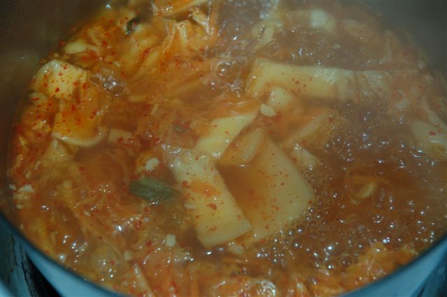 2. 湯鍋中放半鍋水煮滾,而後放入泡菜和調味料,再放入大蔥和洋蔥一起煮滾.